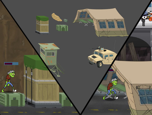 Hand painted 2D cartoon assets that can be used to populate your military scene. These are designed for 2D platform games and other 2D games with an isometric angle art style. These are static 2D assets, there is no normal map at this time for dynamic lighting effects. If you need military cartoon assets, but no time to draw them, this is the package for you.