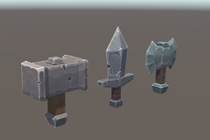 An Ax, a Sword and a Hammer. All assets provided are in super low poly, but with nice hand-painted textures. All three weapons combined are under 300 triangles. These weapons are heavily stylized and are meant for tiny characters.
